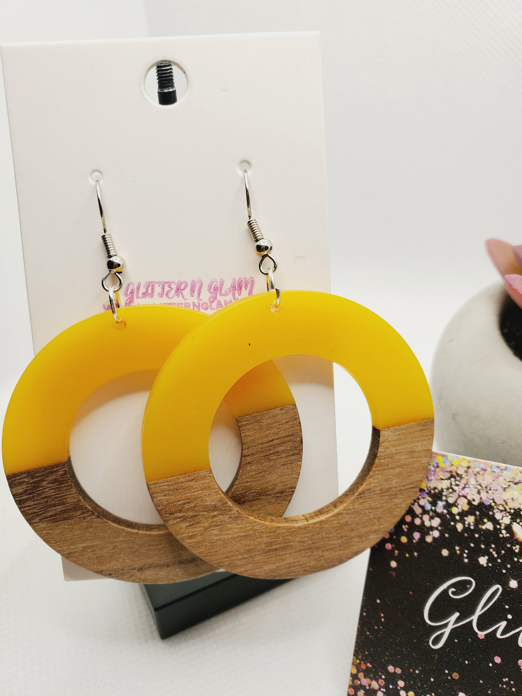 482 Mustard Resin and Wood Circle Dangle Earrings