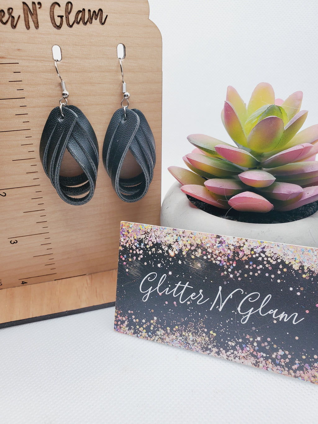 1236 Silver Swiss Dot Leather with Black Wood Dangle Earrings