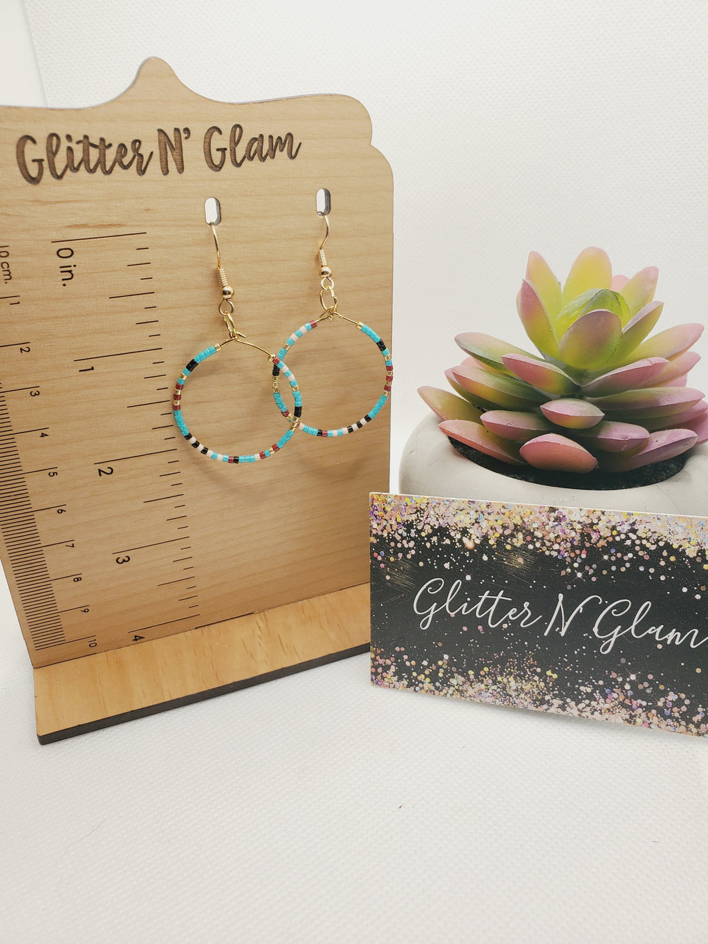 1253 Teal, Black, White and Red Beaded Hoop Dangle Earrings