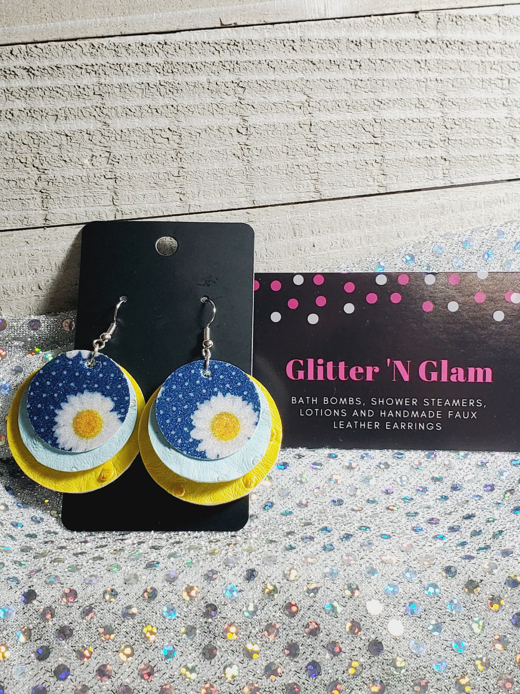 178 Yellow and Blue Daisy Three Layer Circle Dangle Earrings