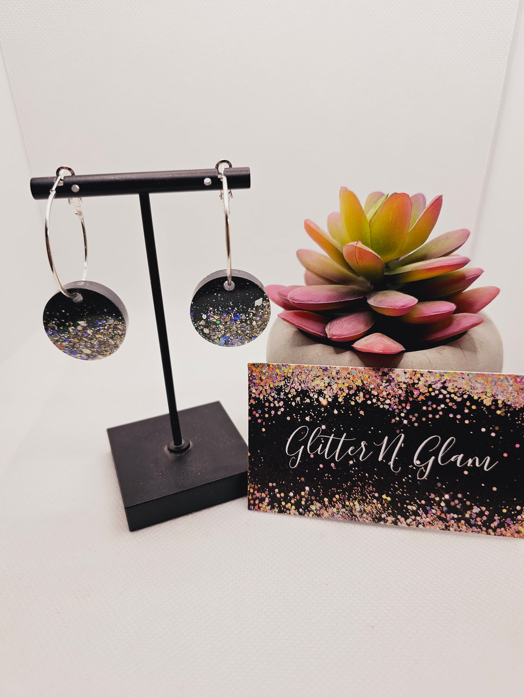 1800 Black with Silver Crushed Glass Resin Hoop Earrings