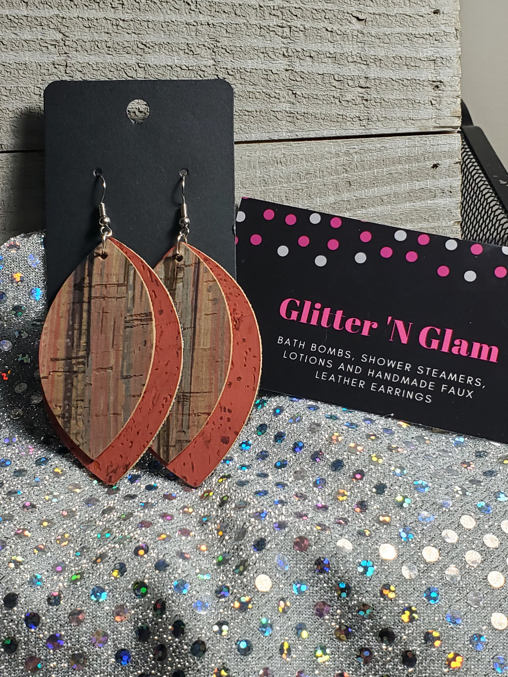 191 Coral and Multi-Colored Cork Leather Pointed Elipes Two Layer Dangle Earrings